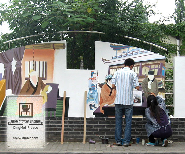每个画面为一个成语,内容分别为“孟母三迁”、“黄香温席”、“悬梁刺股”、“孔融让梨”、“程门立雪”、“寸草春晖”、“岳母刺字”、“愚公移山”、“司马光砸缸”、“襄萤映雪”。通过彩绘的形式,除了让学校的同学们能够更深刻的了解历史,也让街道充满了人文气息。大人带着小朋友经过的时候,都会把成语念出来,无形中中华传统美德就映入人们心中。