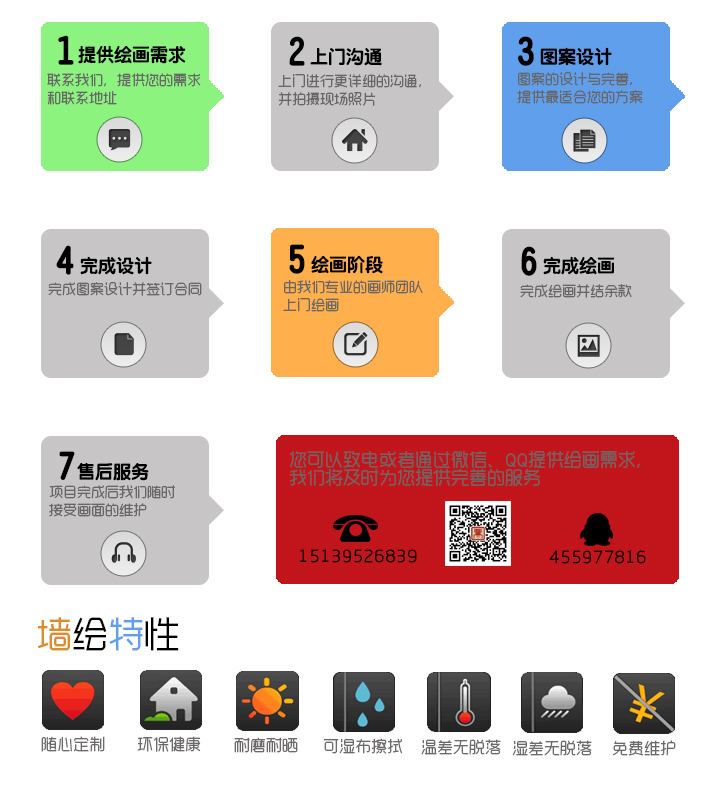 墙体常用的绘画材料—丙烯,环保性能高,不含甲醛等有害物质,无任何异味,画后防水。如有特殊要求,也可以用乳胶漆、油漆或者指定材料进行绘画。